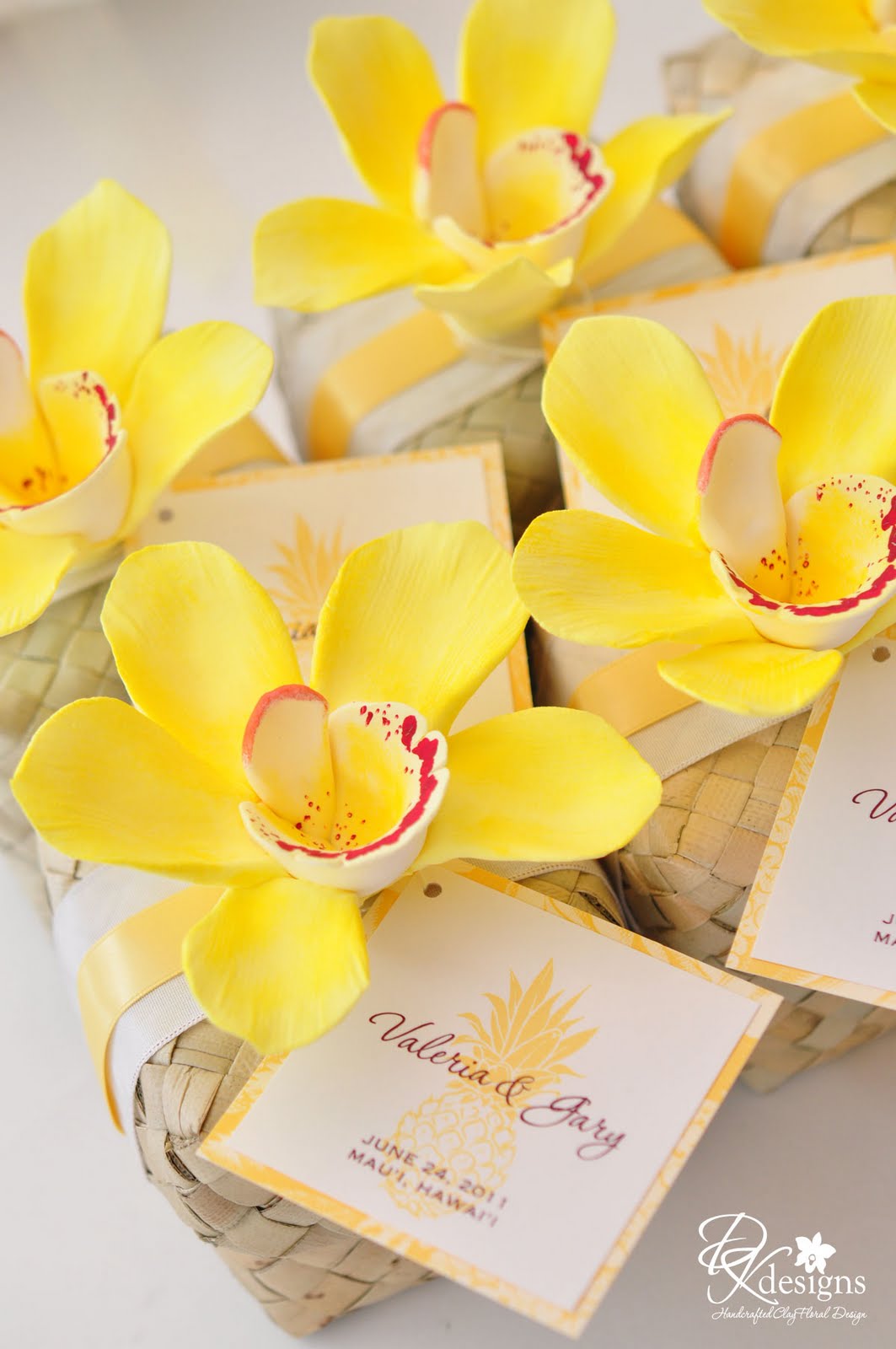 I finished a small order of yellow cymbidium orchid favor boxes and a matching ring pillow. My client, Valeria is having a small destination wedding in Maui later this month. She asked if I could make yellow cymbidium orchids for favor boxes with white and yellow ribbons and a favor tag. She also loved the lauhala ring pillow and asked if I could make her one as well.